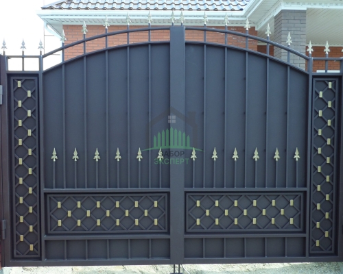 Откатные ворота, кирпич для столбов и все сопутствующие материалы для ленточного фундамента доставляются отдельно.
